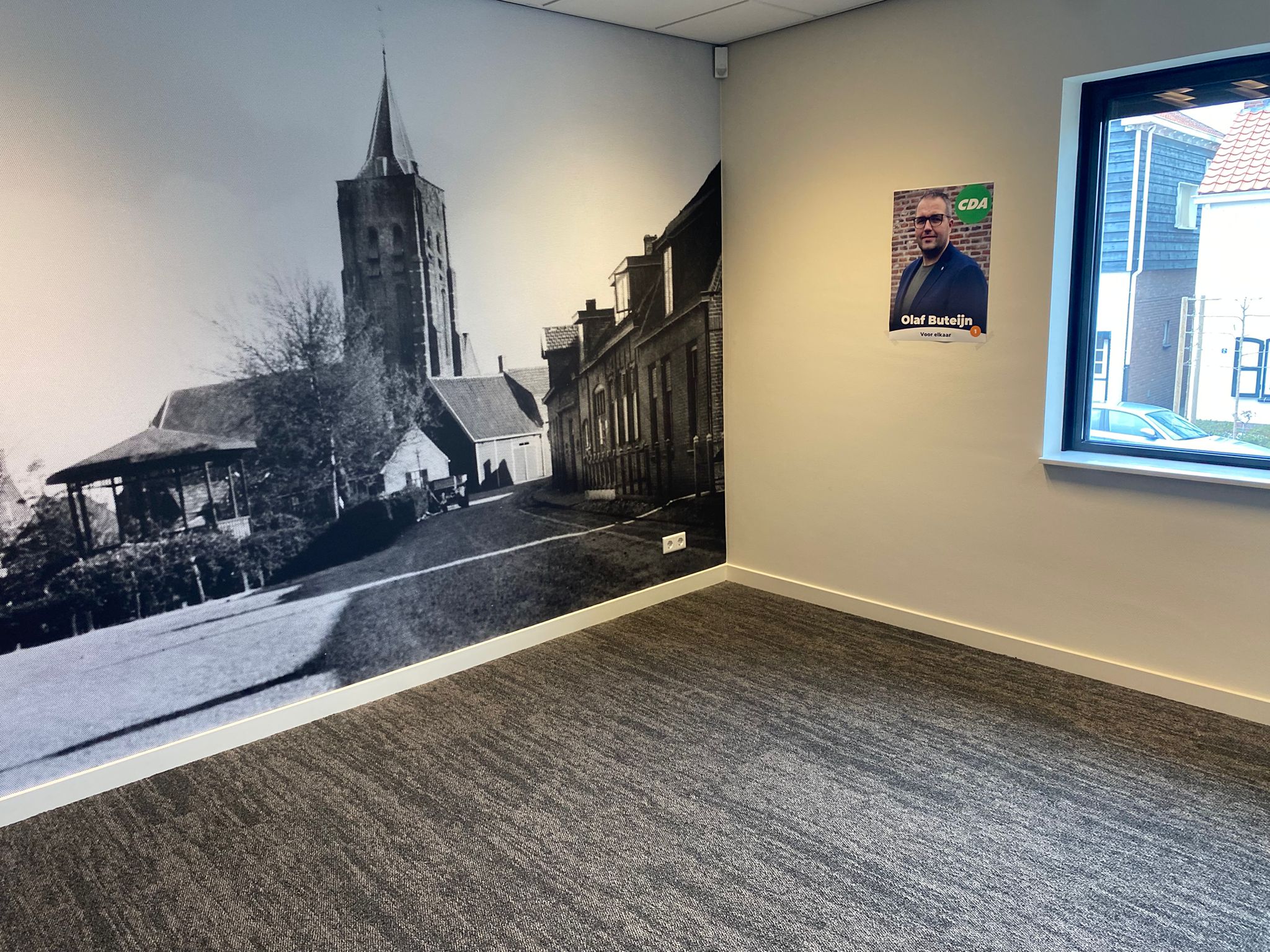 Foto: Eén van de zes nieuwe, kleinere vergaderruimtes; met een muurgrote oude afbeelding van het dorp Yerseke.